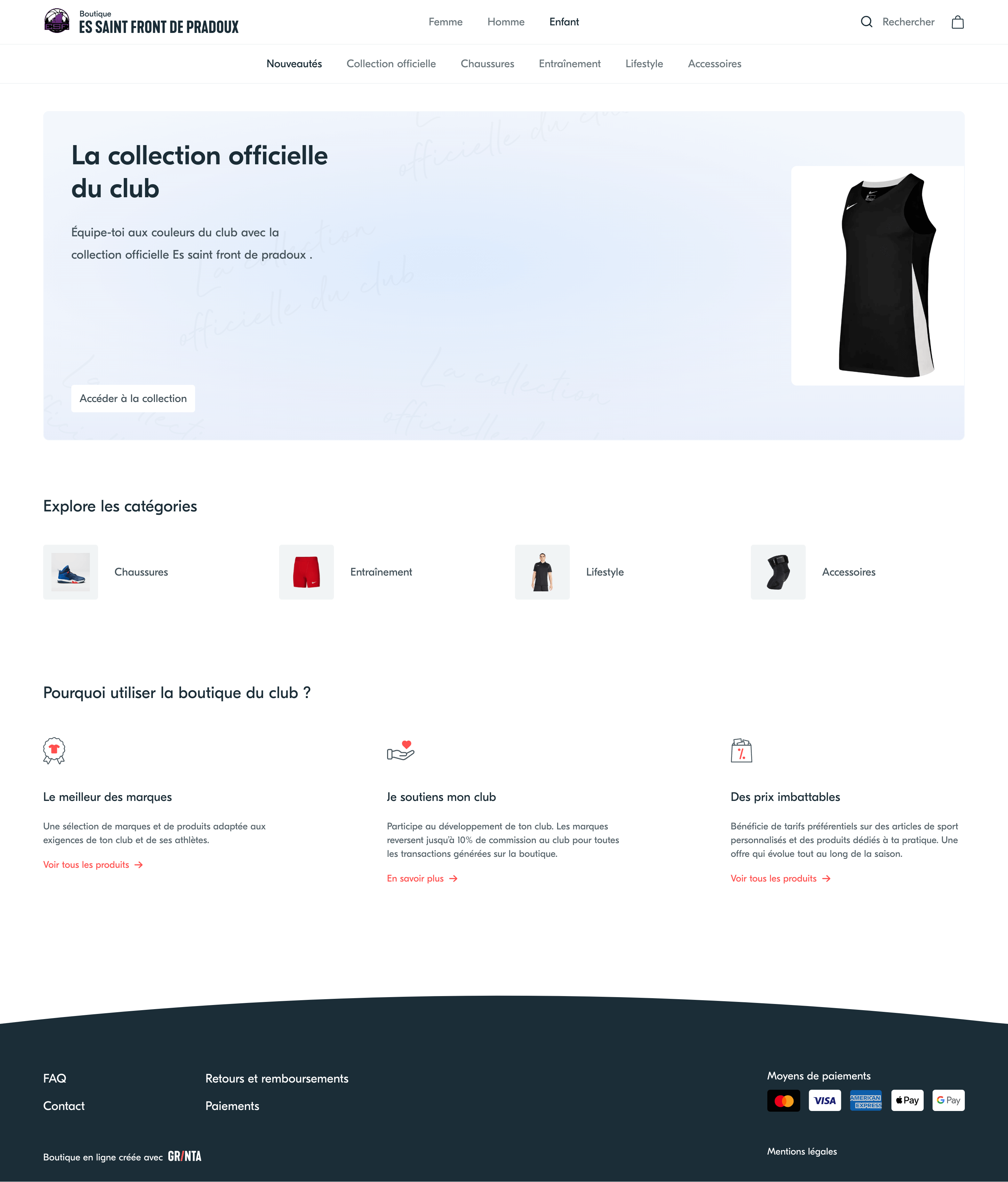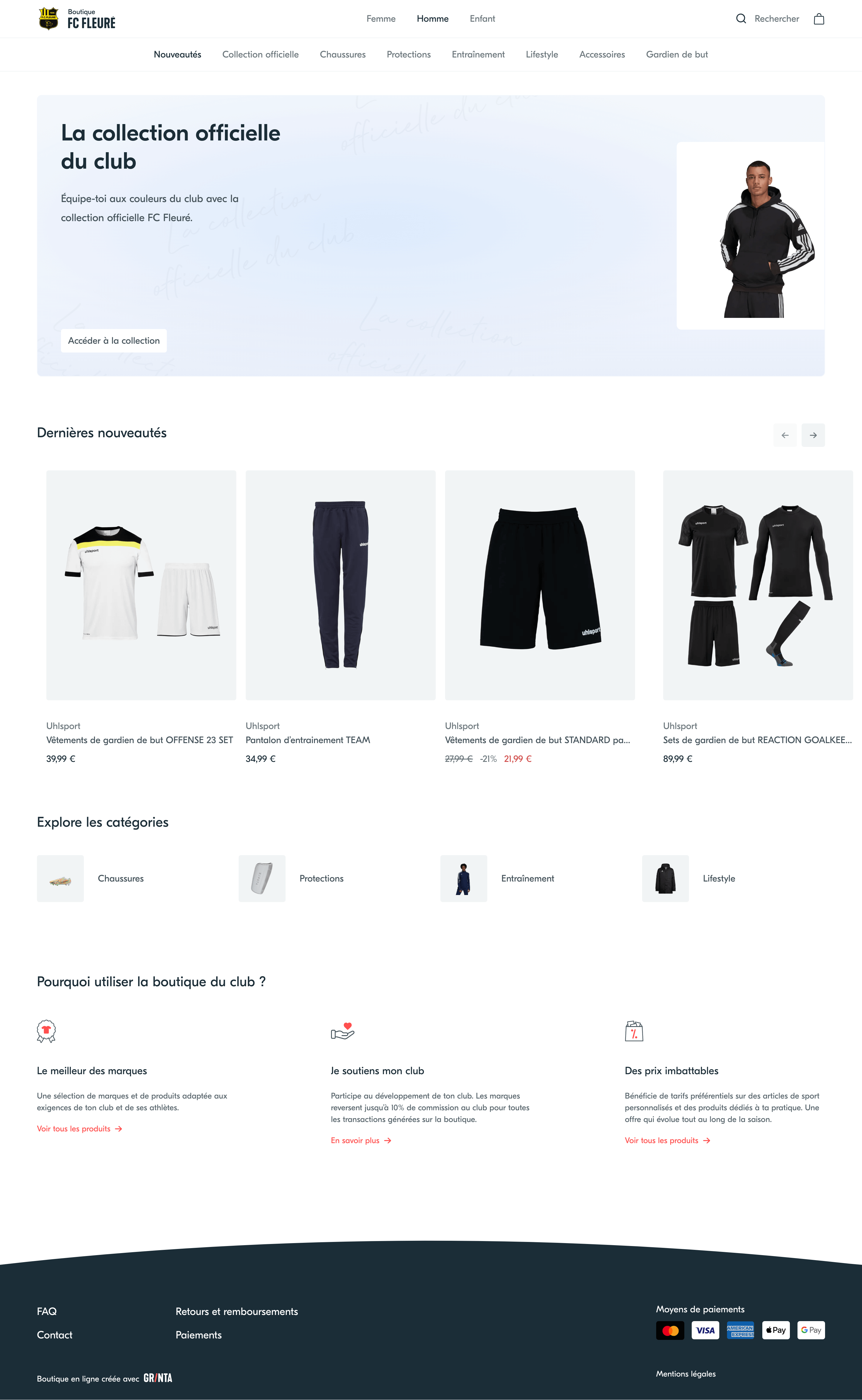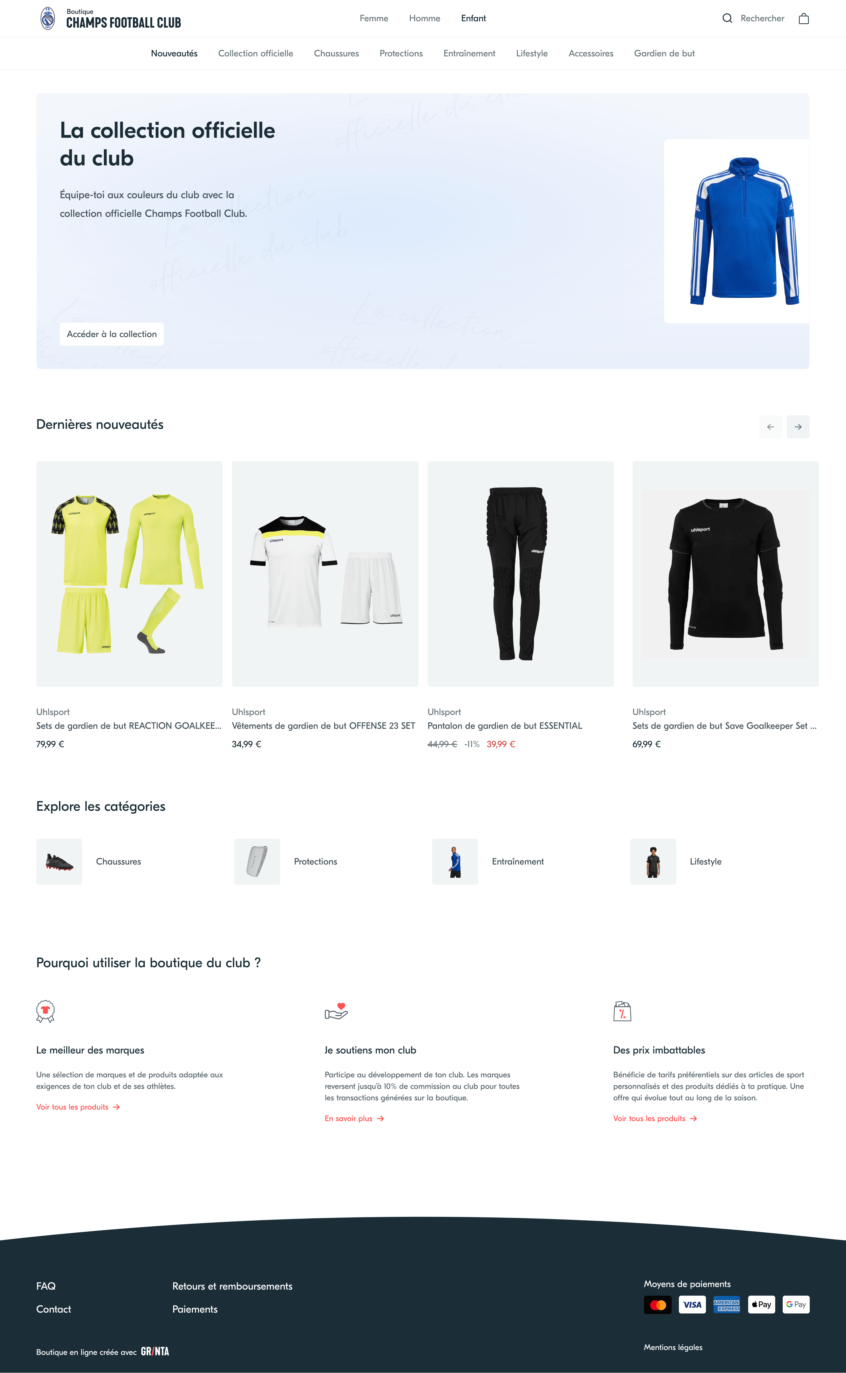 Grinta est la première solution spécialement conçue pour les équipementiers qui vendent aux clubs amateurs. Créez des boutiques en ligne à la volée pour vos clubs. Simplifiez la vente de packs de rentrée et de produits personnalisés. Captez les commandes individuelles des licenciés.