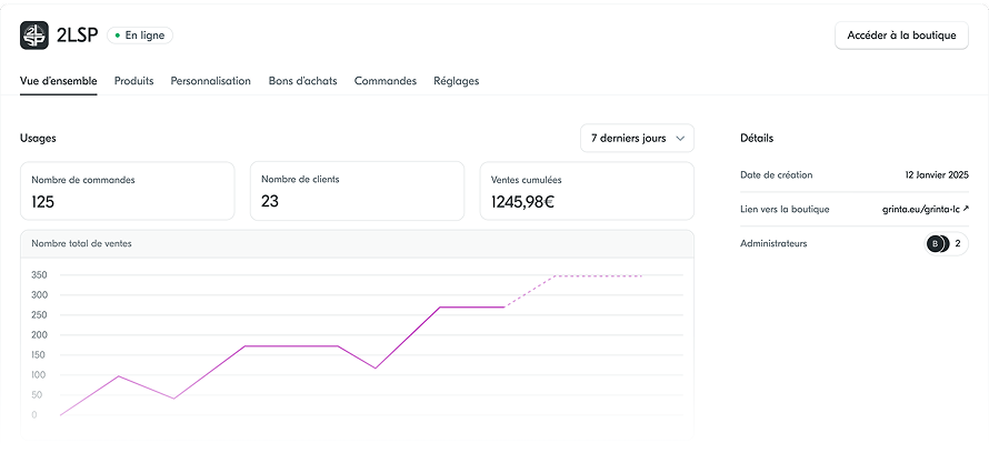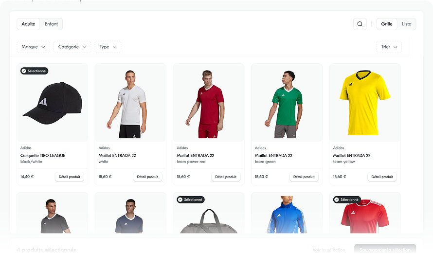 Grinta est la première solution spécialement conçue pour les équipementiers qui vendent aux clubs amateurs. Créez des boutiques en ligne à la volée pour vos clubs. Simplifiez la vente de packs de rentrée et de produits personnalisés. Captez les commandes individuelles des licenciés.